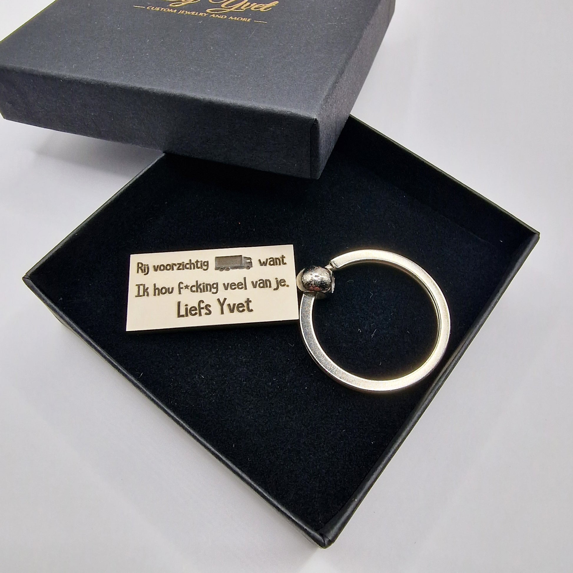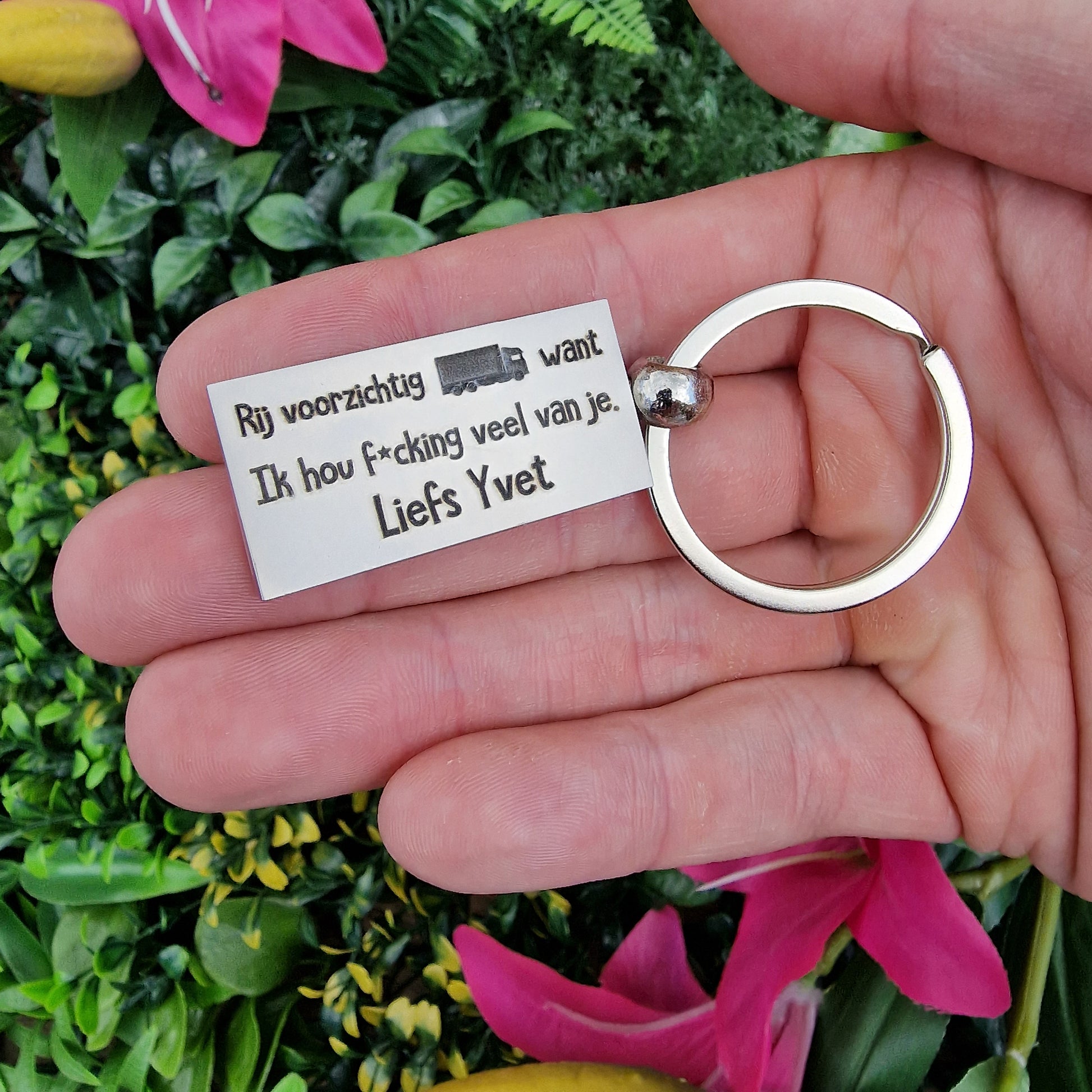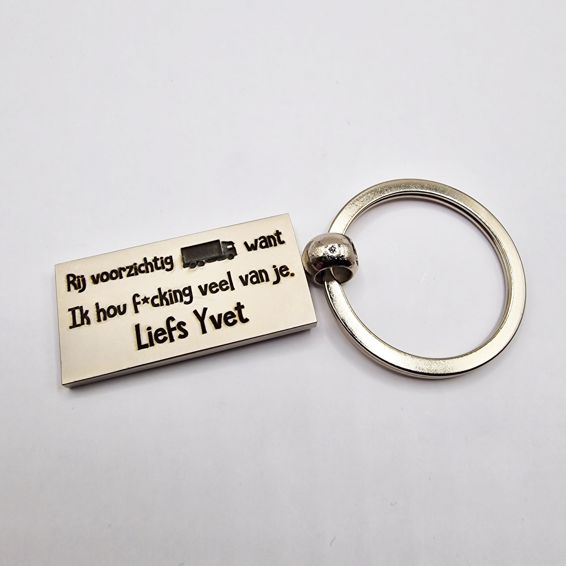 Zeg tegen je geliefde dat hij/zij voorzichtig moet rijden en dat je van hem/haar houdt met deze unieke sleutelhanger! Personaliseer de sleutelhanger met jouw eigen naam. Je kan kiezen uit een auto, motor of vrachtwagen sleutelhanger.