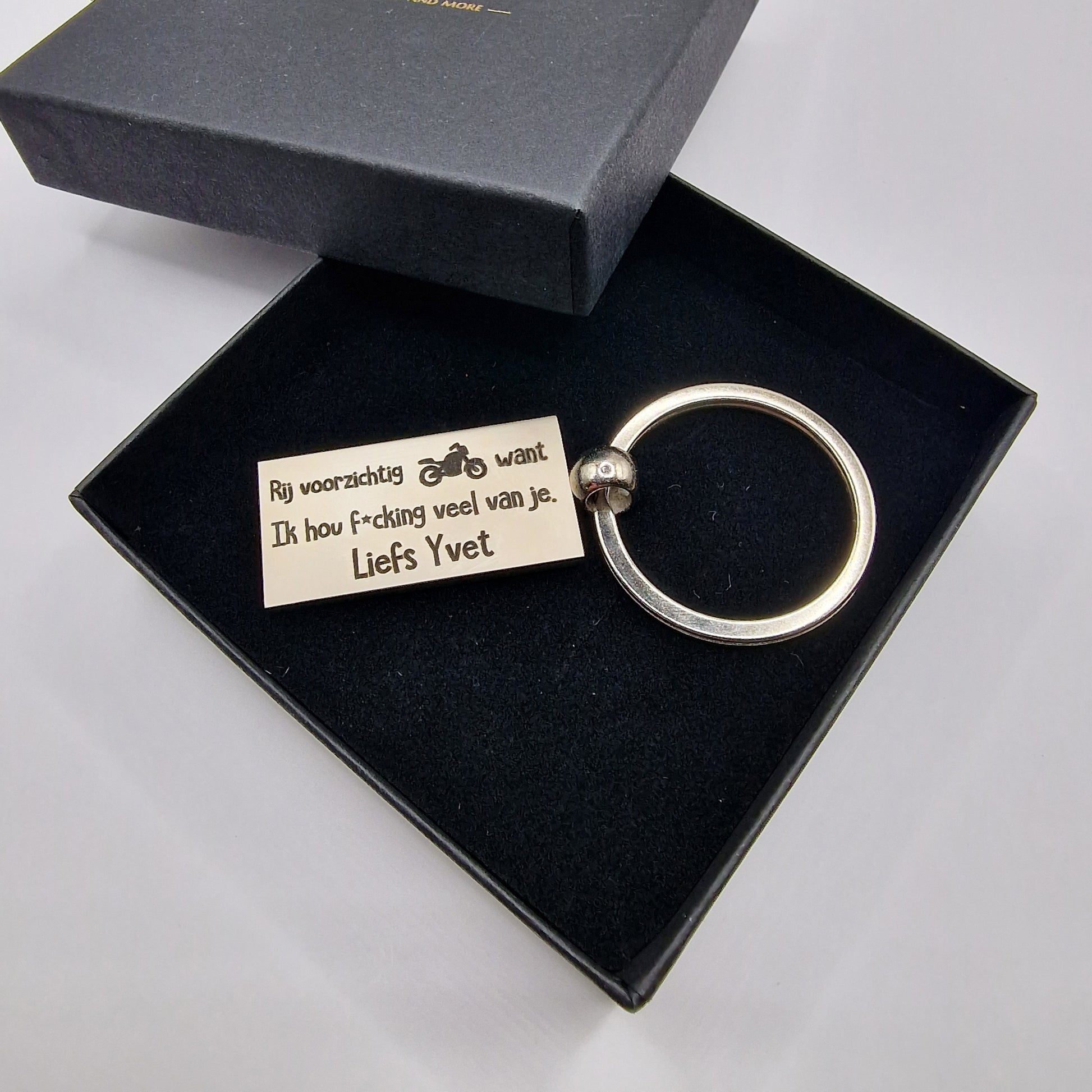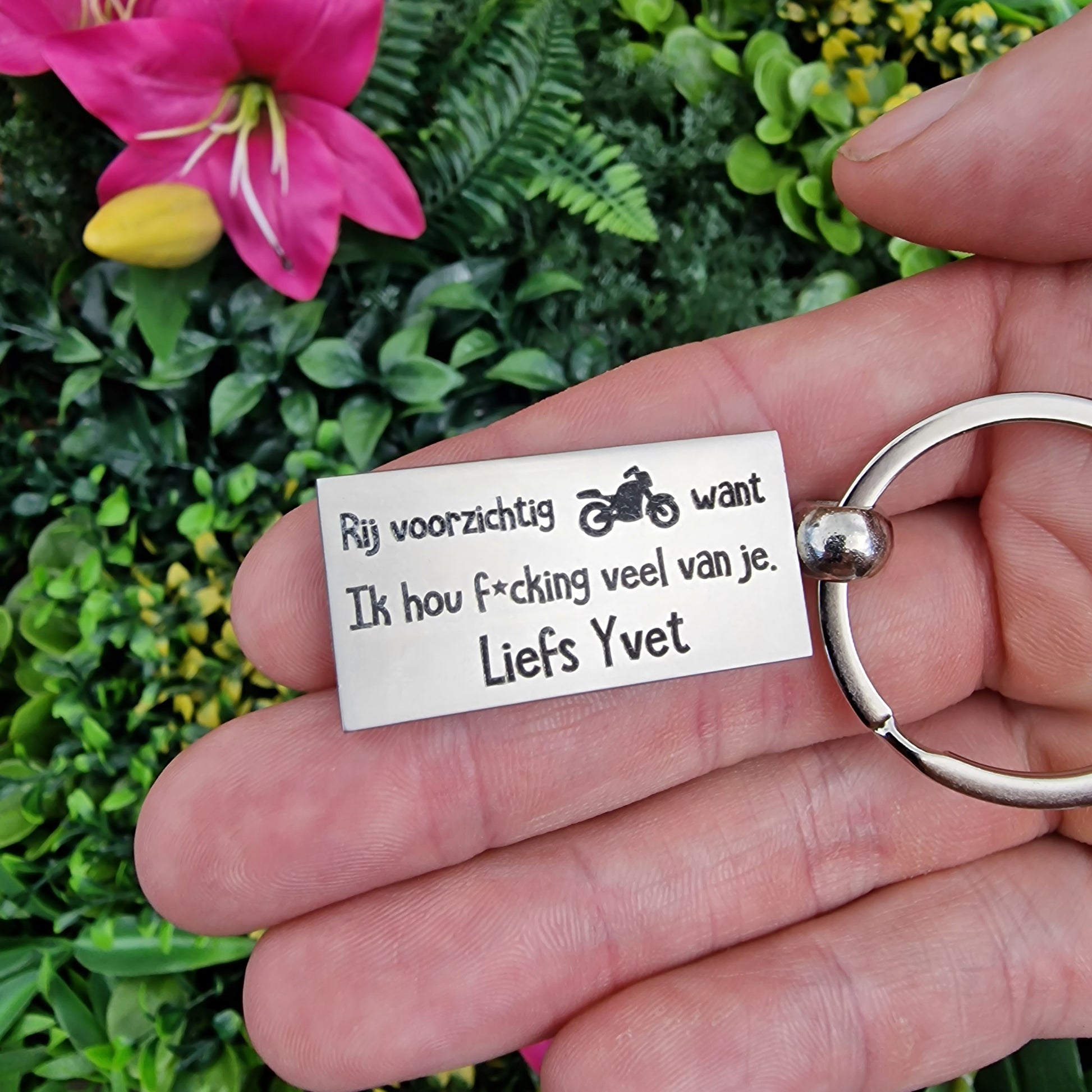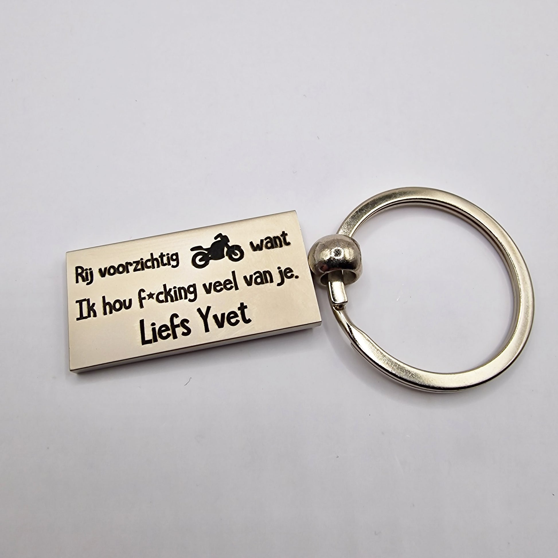 Zeg tegen je geliefde dat hij/zij voorzichtig moet rijden en dat je van hem/haar houdt met deze unieke sleutelhanger! Personaliseer de sleutelhanger met jouw eigen naam. Je kan kiezen uit een auto, motor of vrachtwagen sleutelhanger.